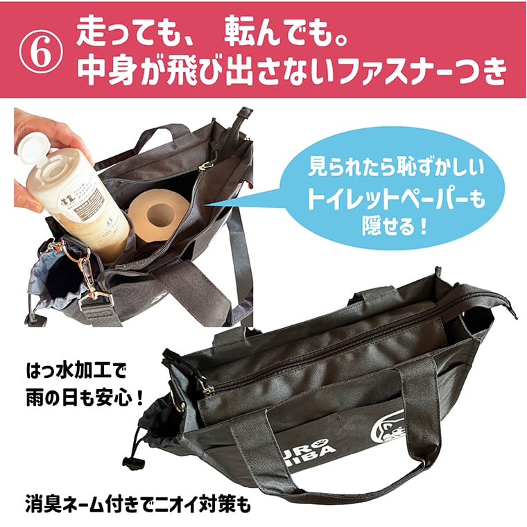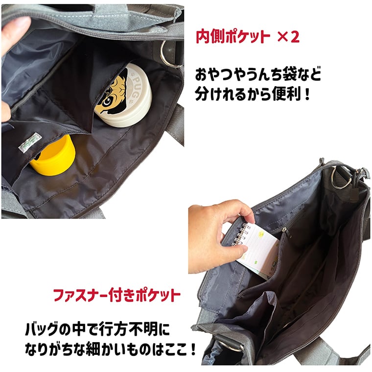 メイン内部にデオドラント(消臭)ネーム付きで、マナー袋の匂いうつりも軽減します。
