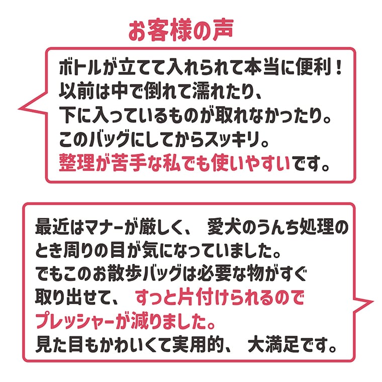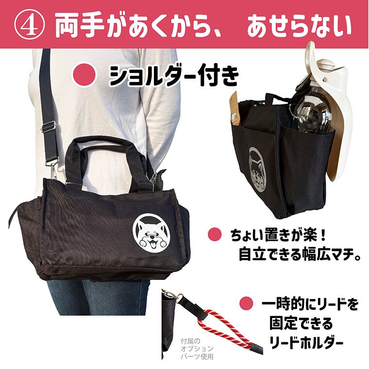 このお散歩バッグは、愛犬のリードやおやつ、ペットシートなど、必要なアイテムをまとめて収納できるスペースを用意しています。