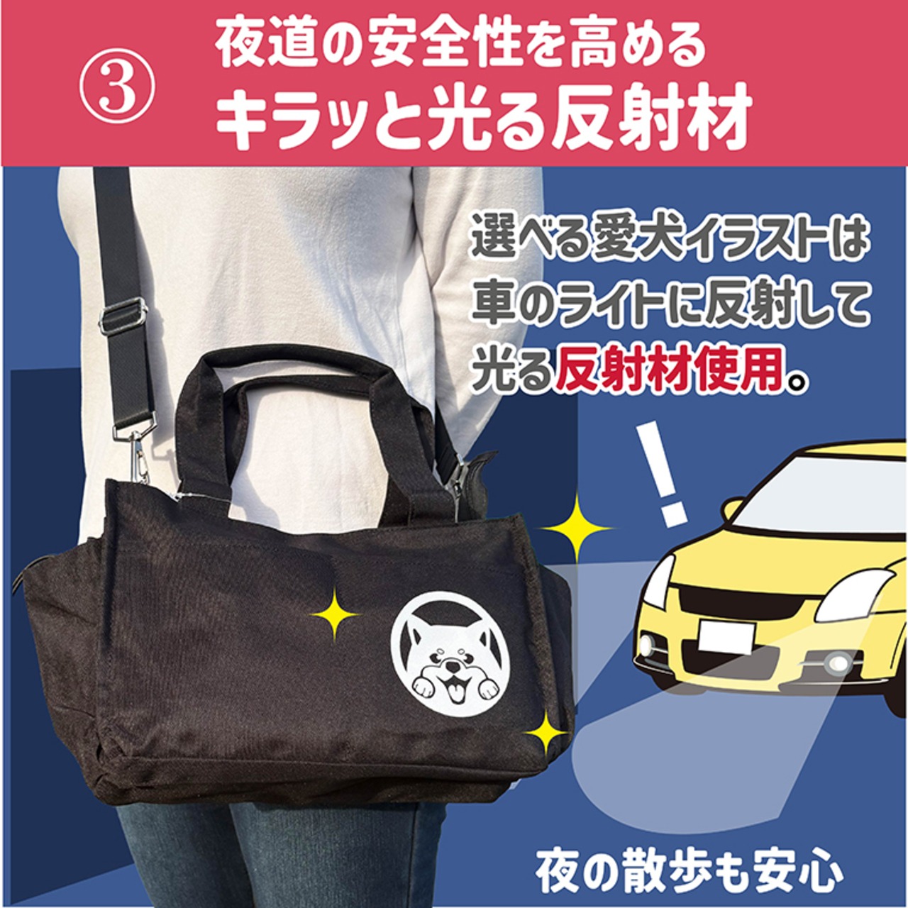 夜道でキラッと光る愛犬ワンポイント 多機能お散歩トートバッグ
