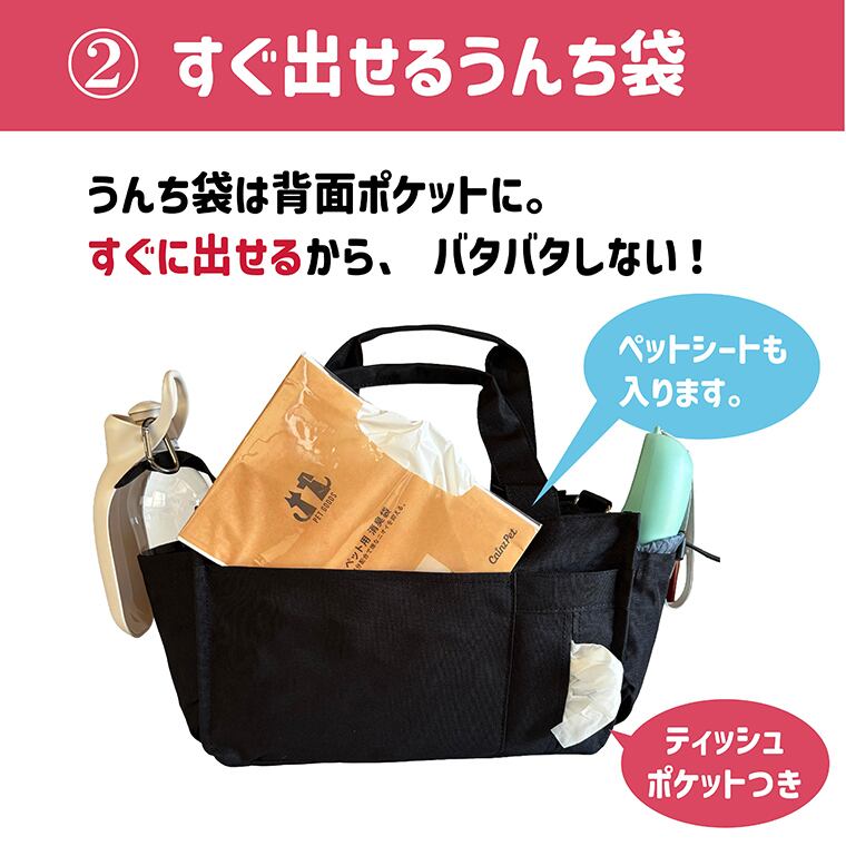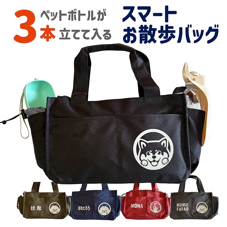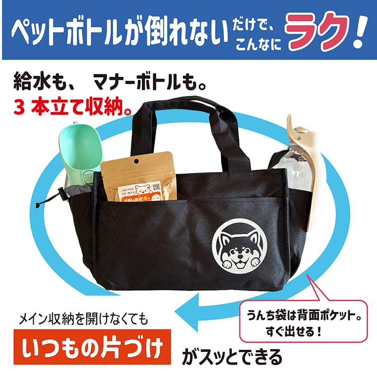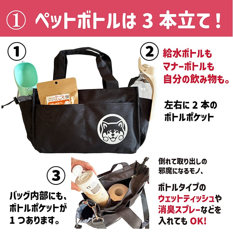 ペットボトルが3本立てて入る 夜道でキラッと光る愛犬ワンポイント付き スマートお散歩トートバッグ