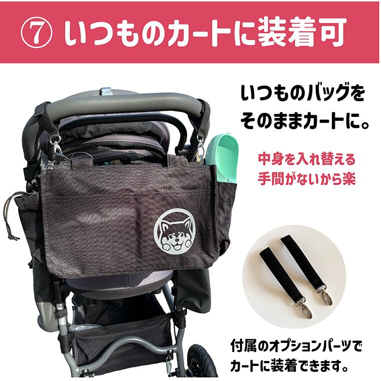 ドッグカートや、ベビーカーに直接バッグを取り付けられるホルダーも付属しております。