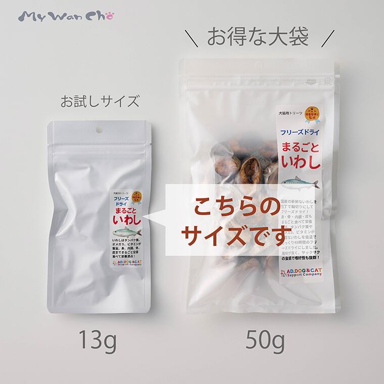 頭から、骨、皮、ウロコ、内臓、尻尾まで、一匹の魚をまるごと全部食べられる栄養満点の「まるごと」トリーツです。